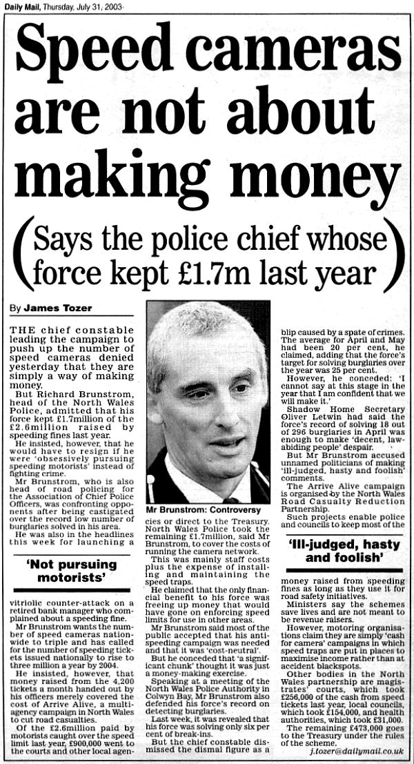 Many people have complained that speed cameras are "all about revenue". We are disappointed to have to point out that this simply isn't the case. With perhaps £150 million pounds on its way to the treasury this year from speeding fines it is easy to assume that a great deal of money is being made. But it must be considered in context. With 30 million vehicles paying over £150 each year on average in vehicle excise duty alone the treasury receives something over £4,500 million pounds per year. If speeding fines were about treasury revenue an increase of just £5 in VED would bring them about the same amount of money without the expenses of operating the cameras, the courts and the rest. Clearly the issues are more complex. One factor causing the dash for cash is that at the local level they sometimes think they can get "road safety for free" by paying for it from speeding fine revenue. We're sure "road safety for free" sounds good to councillors and Police with limited budgets and many demands. But the "free" road safety is next to useless - in fact it seems to be worth exactly what the councils and police are paying for it. Then let's look at a range of vested interests. We wouldn't expect speed camera manufacturers, installers or importers to widely publicise "speed cameras are crap" would we? In fact we're sure they spend a great deal of money trying to convince Scamera Partnership that their cameras will reduce casualties. So the manufacturers have a vested interest in selling the cameras to Scamera partnership who in turn only exist because of the money from fines. The folk at the Scamera Partnership have to justify their jobs to council and police administrators. And the DfT lubricates the whole process with some quite hopeless and highly simplistic road safety information. We don't have any idea why the DfT lubricates the process. Perhaps they have limited thinkers with deeply held beliefs about the dangers of "speed"? |