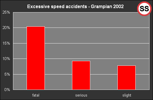 ![]() This chart shows recent figures for one Police force area. Other areas are similar. There are no national figures available. It shows how a greater proportion of fatal and serious accidents have "excessive speed" recorded as a cause or contributory factor. It's certainly not surprising that excessive speed crashes result in death more often. |