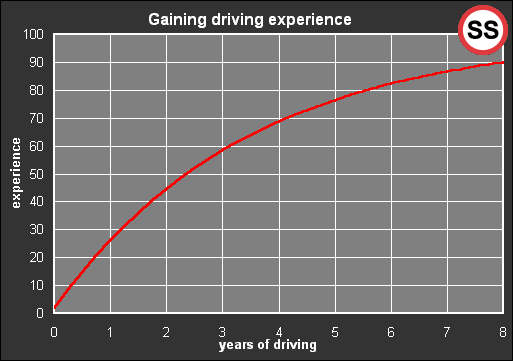 I expect everyone will agree that experience grows more quickly at first and more slowly later. I expect everyone will agree that after about 8 years it's fair to call yourself an experienced driver, and I expect everyone will agree that you never stop gaining in experience. I certainly hope I never stop learning. But what if there was a factor that altered the slope of the curve? What if it starts to take the average driver 10 years to become experienced at the "90" level shown? And what if some drivers stop gaining experience after they have reach some sort of personal comfort zone? - For some individuals this might be below half of the average. |