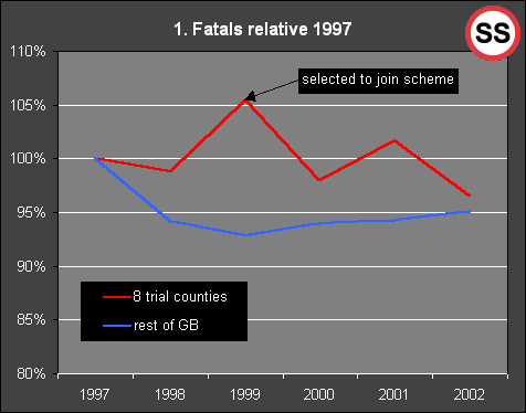 ![]() Figure 1 shows that fatal accidents in the trial 8 counties have been worse than UK trends based on 1997 as a sample year. Selecting the counties for treatment at a high point is a classic way to ensure a regression to the mean benefit illusion. Even with speed cameras the 8 counties have not managed to return to the 95% of 1997 levels that the rest of the UK has achieved. |