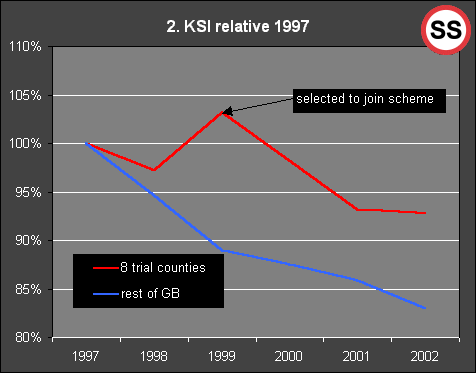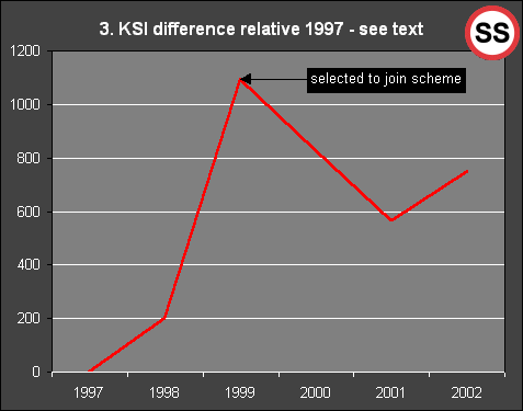 ![]() In Figure 3 we have calculated the number of "KSI" in the 8 counties who would not have been "KSI" if the 8 counties in the scheme had followed the trends in the rest of the UK. When the 8 counties were chosen for the scheme, they were already 1,092 KSI worse than the general UK trend. Without speed cameras and without speed camera hypothecation we might have expected the 8 to return to the general UK trend. But no such return took place. The fall in 2000 (the first year of the scheme) was less than the rise in 1999! Even 2000 and 2001 together didn't equal the rise in 1999. And in 2002 the figures started to rise again relative to the UK trend. |