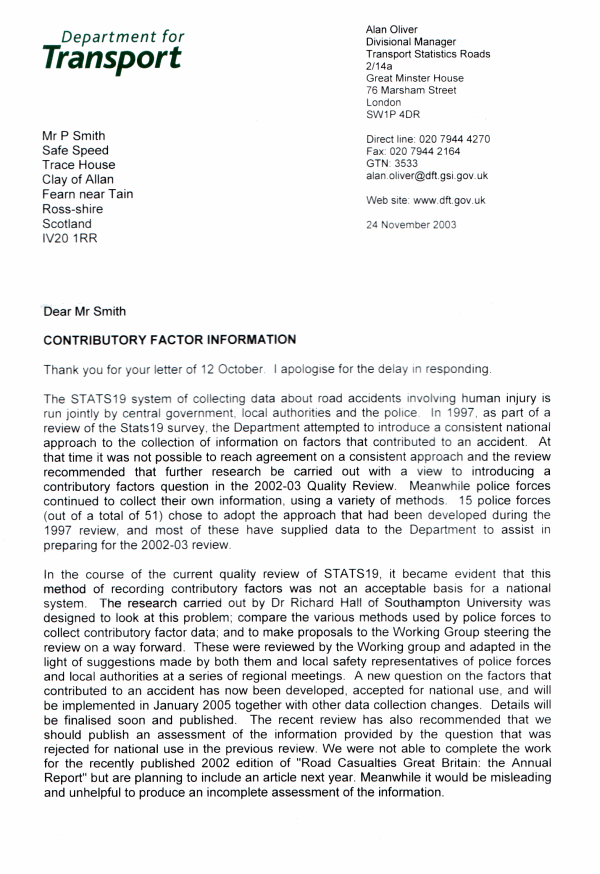 Paul Smith I am afraid this is the first I have seen of your letter of May 20th. I guess part of the reason is that I left DfT in April to work in a different work area in a different building in a different department. There was no one to replace my function at DfT so some things have alas been left unattended at my original desk. I am sorry that your letter has not received the attention it should have and also that I did not pick up on your January e mail. I cannot explain the latter lapse especially since all consultation e emails were logged in a separate file - but the 2 events have conspired to create a regrettable delay. My apologies. The situation that I left in April is that the review report was about 99% complete and was being prepared for publication - it has to go through clearance procedures with Ministers and the Office for National Statistics. I know it is not yet available but it cannot be that far off. The report comes in Four parts. The second part addresses the issues of access to and presentation of data. This includes a recommendation that presentation of an analysis of the contributory factor data already supplied by the 15 police forces on a voluntary basis should be included in RAGB. This is clearly desirable and will be followed through by the road accident statistics branch. I cannot say whether there is a plan to include an article in this year's RAGB or whether it will be for next year. I can only suggest that you keep in touch with Mr Alan Oliver who is looking after the review now that I have left and will know what future plans are. I am copying this reply to him. When the report is finally published all four parts will be published on the Internet, but consultees will receive a hard copy of the main reports. I hope this helps. If you need to come back to me directly a reply to this email address will get through. Peter Wilding