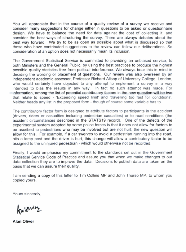 There is an ongoing official project to create a national standard for collection of road accident contributory factors. When the project is complete the data so gathered will be (or should be) valuable in determining the causes of road accidents. Good understanding of real causes will be very helpful in future accident prevention. So far so good. This work is controlled by the "standing committee on road accident statistics" (SCRAS) at the DfT. Recently they have been assisted by Dr Richard Hall from the Transport Research Group at Southampton University. Dr Hall informed us that his work was completed and submitted at the end of March 2003. We have yet to see anything about what that work contained or concluded. This document (well worth a read) contains some interesting information: Page 3 contains: Fifteen police forces are currently supplying contributory factor information to DfT, using the proposed national form, on a voluntary basis.Page 11 contains: MODIFICATIONS TO EXISTING CODESWe are extremely concerned that there are ongoing efforts to suppress real data and also to twist future data to better fit false conceptions. |