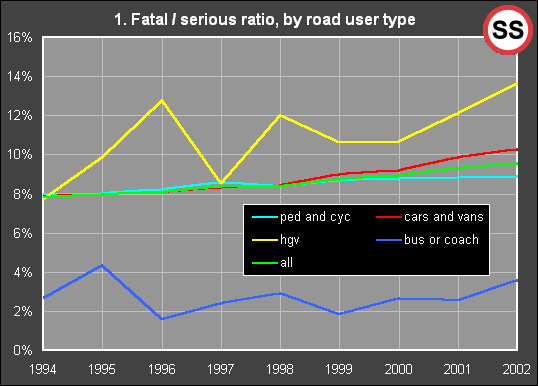 This graph shows falling trends in the serious injuries / all injuries ratio for all road user groups |