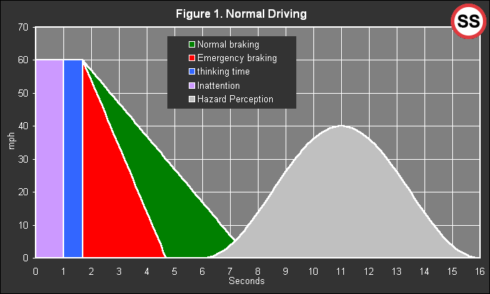 Notes to Figure 1. Figure 1 illustrates an instant in time on a 60 mph road. The driver is looking and planning ahead, ready to deal with hazards that might appear to him in the grey hazard perception area. (Naturally the hazard perception area is illustrative, and does not relate to the mph scale.) Our driver knows that if anything appears to him in the grey hazard perception zone, he will be able to stop before he reaches it. He's even allowed for the possibility of a second of inattention, perhaps a mirror check. He knows that there are no hazards closer than 6 seconds and knows that if anything appears ahead he can stop in time. This is normal driving. Consider the two illustrated braking options. The green area represents braking at 0.45g, which is about the max level before things become uncomfortable for passengers. In normal driving we shouldn't plan to exceed this level of braking. The red area represents what can be achieved in an emergency. Our driver keeps the difference between the two sorts of braking as a margin for error. At 60 mph the difference is about 3 seconds, and if hazard perception doesn't work, or something entirely unexpected happens emergency braking is available. There are two areas which represent driver inaction. The first pinkish area represents inattention and the blue area represents thinking (or reaction) time. Notice how long periods of inattention would push the braking zones well into the hazard perception zone. This is one of the main failures in driving, and it illustrates the situation where you don't see something until it's too late. Even so it would normally be possible to get some braking in before impact. Remember we said this is an instant in time? That's very important. Suppose there is a hazard in the grey zone. It might not be serious enough to cause us to come to a full stop, but it will cause us to adjust speed. Having adjusted speed we can then stop in a shorter time, and at this new instant in time we are ready to deal with closer hazards. To understand this better, let's look briefly at an extreme example. It's a very busy situation, (imagine crowds of people, with some of them in the road) and we've slowed to just 5 mph. The same rules about safe braking zones apply, but now the distances involved are much smaller. Although we've illustrated a 60 mph situation, exactly the same shapes and layout apply to any speed. We always look ahead beyond our safe braking zone, and adjust our speed if there's a risk of our safe braking zone becoming obstructed. The speed adjustment can be all the way down to stationary if the situation demands it. The hazard recognition zone It stands to reason that you can't first see a road hazard 20 miles ahead, and it's obvious that recognising a road hazard when it's 1 foot ahead would lead to an "instant accident" and is a very rare occurrence indeed. Between these extremes there's a range where all hazards must be recognised. Almost all hazards almost all of the time are recognised when they are far enough ahead that we can deal with them safely and without drama. It's important to consider the differences between proper recognition and the failures that lead to accidents. |