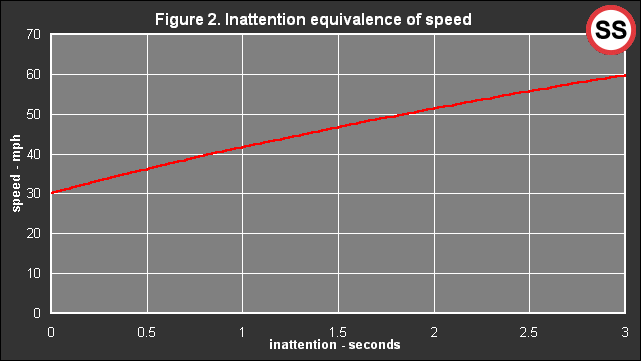 Refer to the following graph. We have calculated the equivalence between inattention and higher speed. So, for example, a driver at 30 mph who exhibits 1.5 seconds of inattention will come to rest at the same spot in response to the same stimulus as a driver at almost 47 mph with no inattention. We hope this demonstrates that driver inattention has a dramatic effect on safety. Quite a few reports - including the RoSPA report cited above - suggest that more than 2.5 seconds of inattention is fairly commonplace - this can produce a similar effect to driving at over 55 mph in a 30 mph zone.