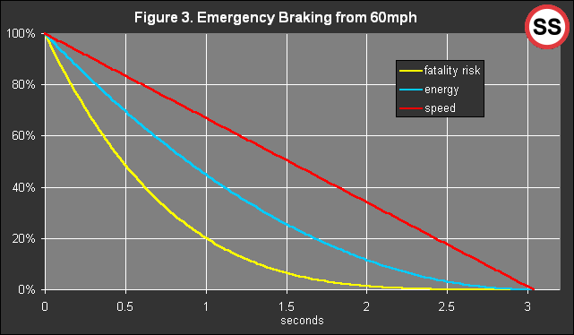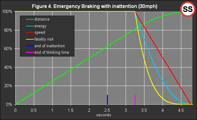 Notice how rapidly the potential fatality risk falls once braking has started? After just half a second of braking from 60 mph the risk of fatality is halved. If the driver had been inattentive for just half a second, braking would not have started and the risk of fatality would be doubled. But 1.5 seconds of inattention is commonplace (apparently). If that 1.5 seconds of inattention is combined with a need to carry out emergency braking the calculated fatality risk increases by 15 times from 6.6% to 100% of the original value. This effect is enormous. It should be obvious that tiny changes in average driver attention would lead to quite large changes in roads fatalities. |