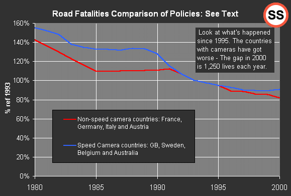 We predicted a loss in road safety as soon as the cameras were first talked about back in about 1989. It's no surprise at all to see this tragedy played out on roads in many countries round the world. We well understand a range of mechanisms whereby excessive speed enforcement should tend to have the effect of reducing road safety. All the while that speed enforcement is making drivers more dangerous, roads and vehicles are getting safer. We think the roads and vehicles trends show clearly in the improving trends showing in Germany and France for example. If this is true, then roads and vehicles are getting safer in the UK too, but this trend is balanced by worse driving standards. We suggest that lower driving standards are caused by excessive speed enforcement. |