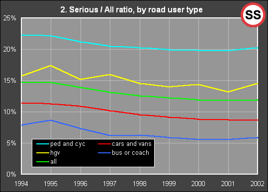 This graph shows falling trends in the serious injuries / all injuries ratio for all road user groups |
