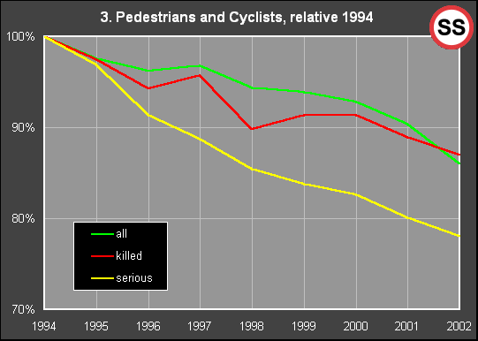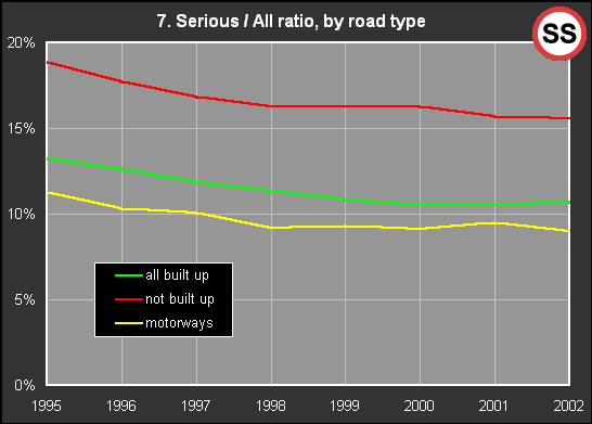 This page provides further information in support of our page "serious". The "serious" page points out that our national serious road injury figures are behaving strangely relative to killed and slight injury figures. It was suggested to us that the altered ratios might be due to vehicle air bags or some other localised effect. We investigated ratios across road user types and across road types. In all cases the serious injury figures exhibit the same strange behaviour. See the graphs below: |