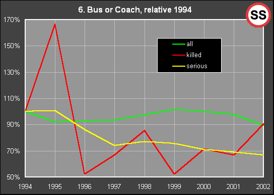 Small numbers of injuries (and especially fatalities) make it hard to be sure about the trends for bus and coach occupants. |