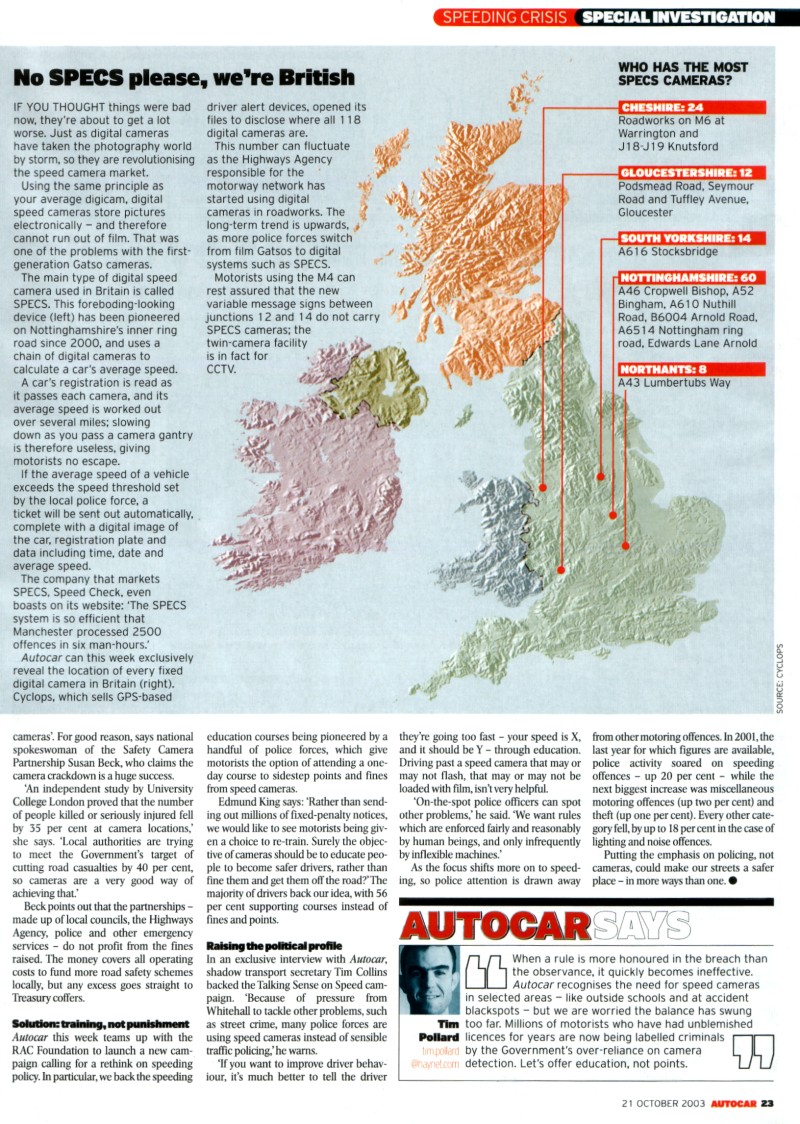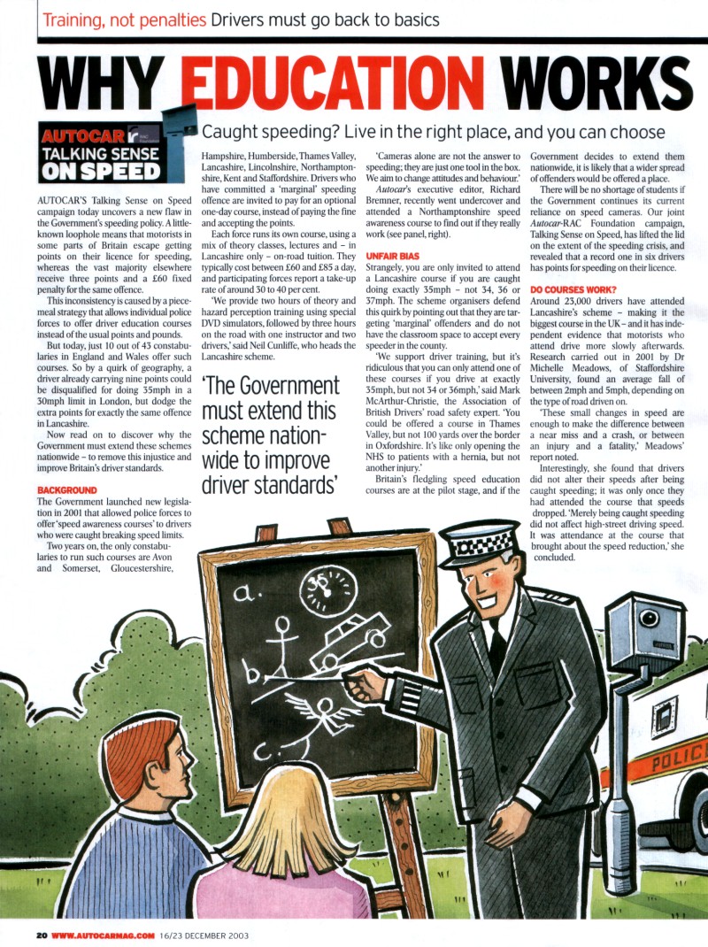 Safe Speed comments: Autocar here are calling for more "speed awareness courses" as an alternative to fines and points. We disagree strongly that "speed awareness courses" are a good idea - in fact we think such courses are actually dangerous. The courses focus on numerical speed and feed false safety messages to drivers. Feeding false safety messages to drivers distorts their safety priorities and in the real world may well make them more dangerous. |
