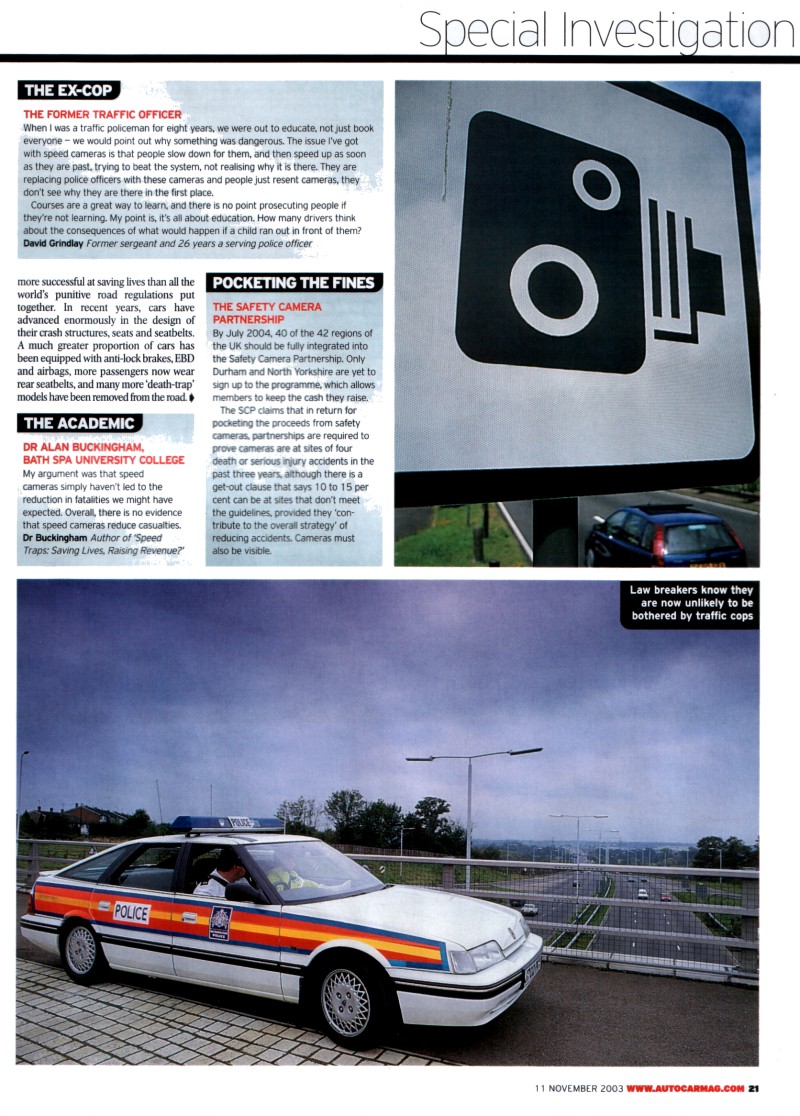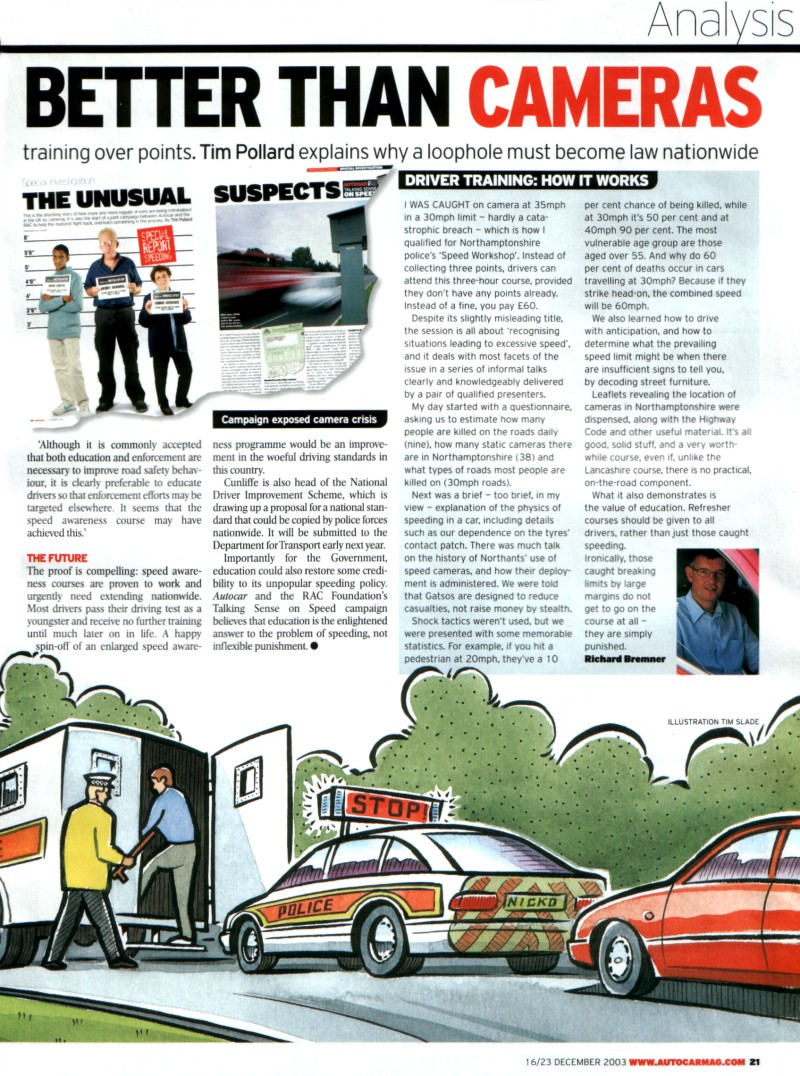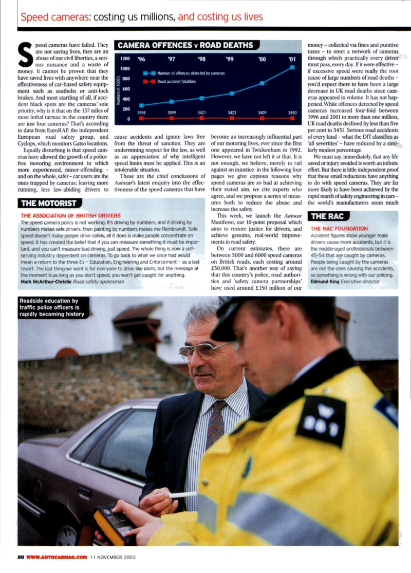 By September this year almost 15,000 drivers had been on the course. These courses are self-funding with the drivers paying £85 - which covers a theory and practical element. Ironically these courses are only offered to drivers caught driving at exactly 35 mph in a 30 limit. Other schemes have been set up in Staffordshire, Northamptonshire, Lincolnshire and in the Thames Valley. It is likely that a working group will be set up to look at some national guidelines. The Campaign is calling for courses to be offered to drivers caught speeding above the ACPO guidelines. The academic evaluation of the Lancashire course by Steve Stradling at Napier and Michelle Meadows at Staffordshire University shows that it does have positive effects on road safety. "The reduction in speed which drivers reported driving at on high streets occurring between being offered a place on the course and actually attending the course was not statistically significant. The reduction in speed in the three months after attending the course was significant. In other words, merely being caught speeding did not affect high street driving speed. It was attendance at the course that brought about the speed reduction". Dr M L Meadows. The Campaign aims to lead a responsible debate on speeding issues through the pages of Autocar, national media and amongst MPs and Ministers. Edmund King, executive director of the RAC Foundation said "There is a role for camera enforcement at traffic lights and accident blackspots but we should certainly not rejoice at a million plus prosecutions. The camera should be one weapon in the police armoury rather than the entire arsenal. We have seen a correlation between the increase in speed cameras and the decrease in traffic police. Rather than sending out millions of fixed penalty notices we would like to see motorists being given a choice to re- train. Surely the objective of cameras should be to educate people to become safer drivers rather than fine them and get them off the road?" The campaign objectives are to improve road safety by: